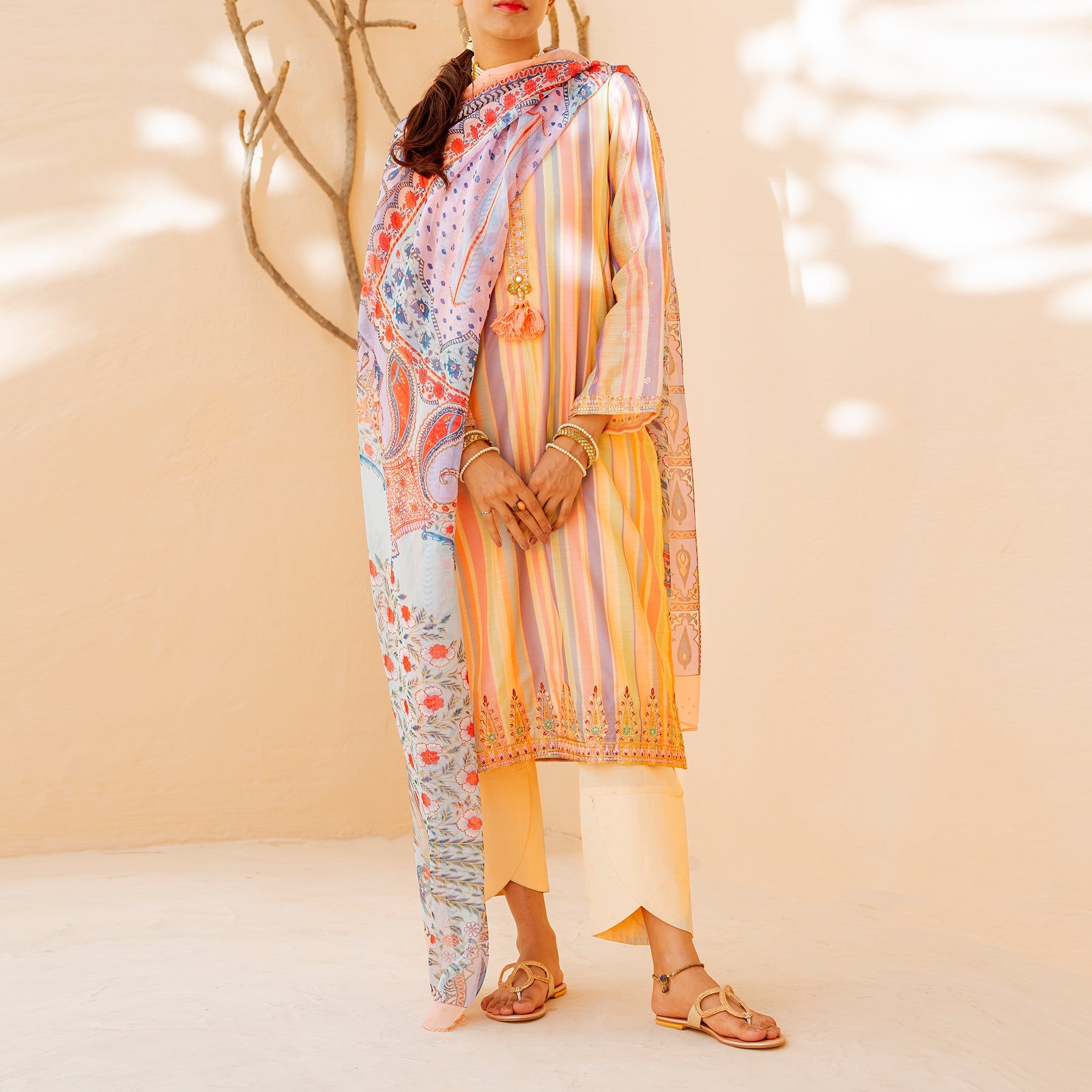 Embroidered Paper Cotton Shirt with Gota Tassels on Neckline and Print Silk Dupatta is a captivating ensemble that effortlessly combines style and grace. The shirt, crafted from lightweight and breathable paper cotton fabric, features intricate embroidery, adding a touch of elegance and sophistication.
