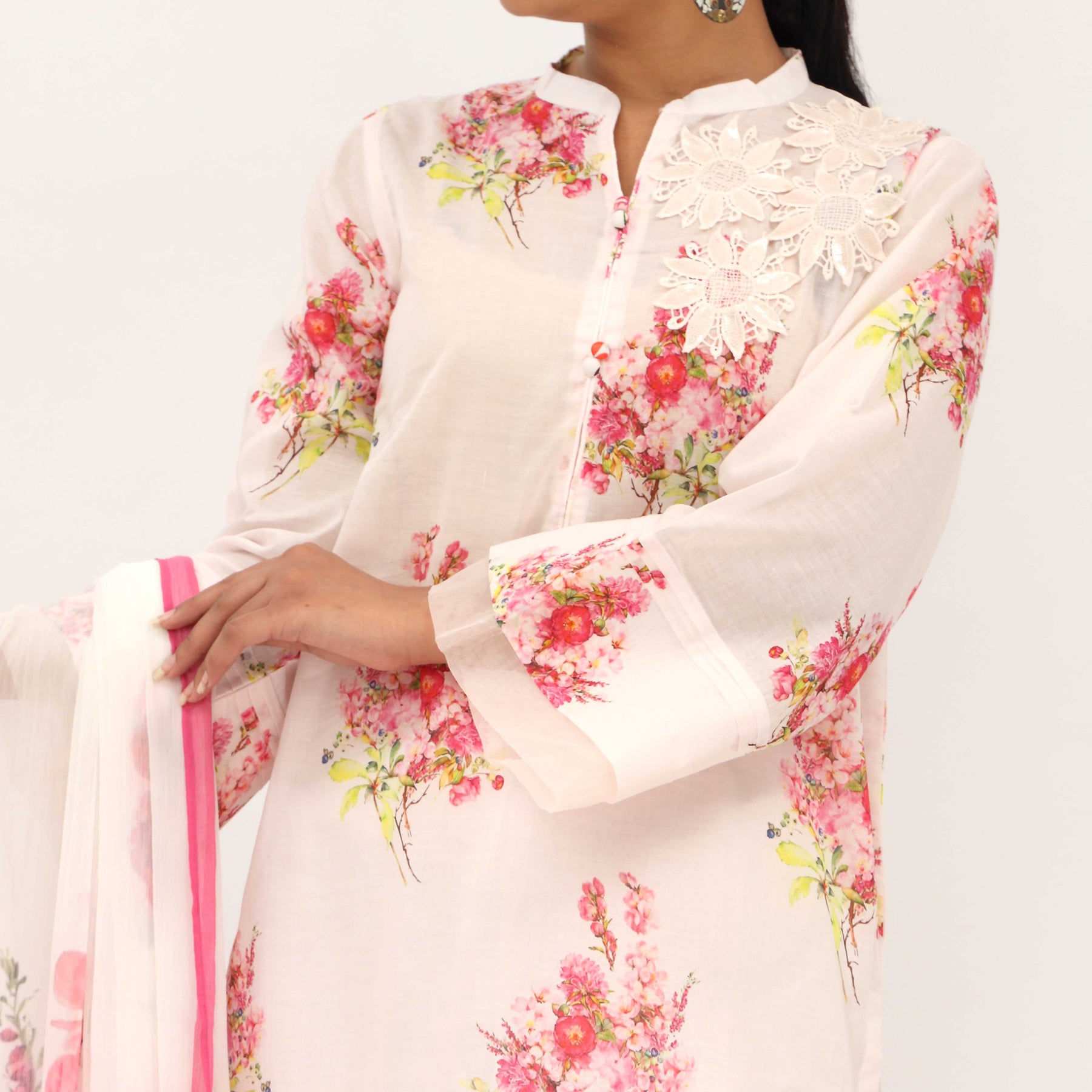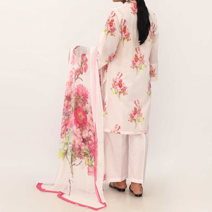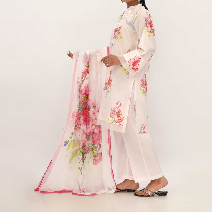 Digital Printed Lawn Shirt with Floral Patches, Cambric Trouser and Printed Chiffon Dupatta