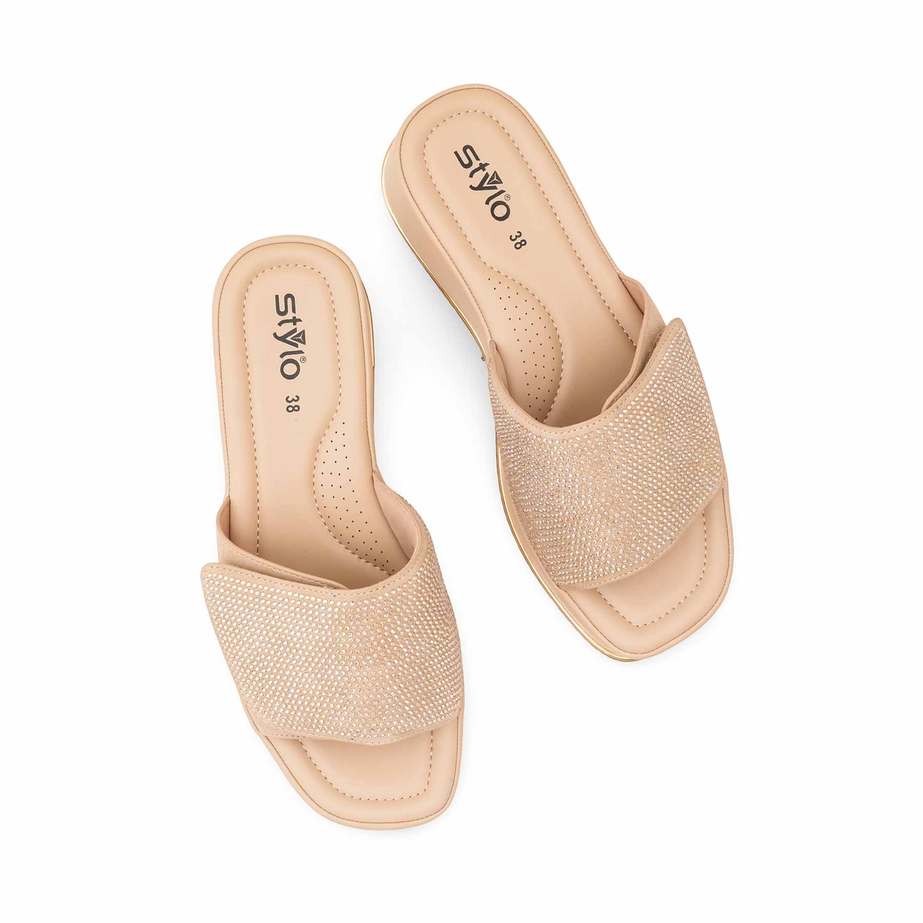 Elevate your evening or formal look with our Beige Formal Slippers for ladies. These stylish platform wedge slippers feature a wide upper strap dazzling with all-over rhinestones and an adjustable hook-and-loop closure for a secure, glamorous, and comfortable fit.