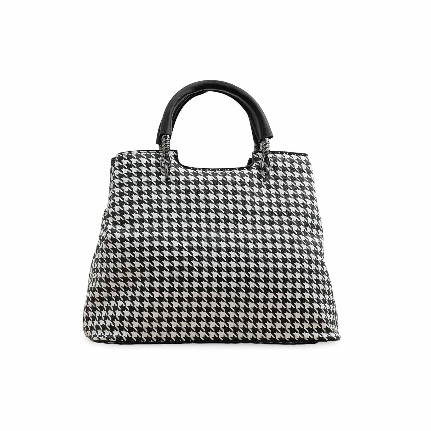 This chic bag features a classic black and white pattern and a unique, curved handle.
