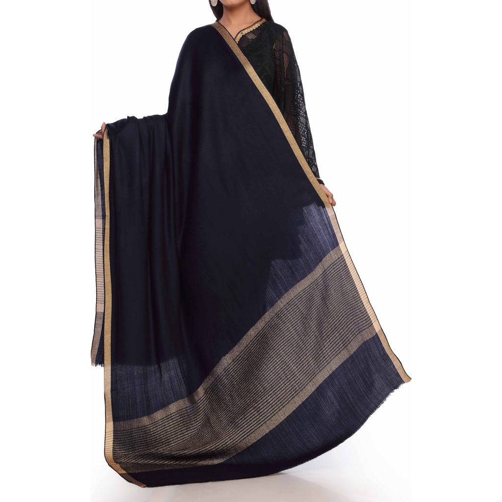 Spruce up your eastern outfit by pairing it with this blue striped and border acrylic shawl featuring an eye-catching design.