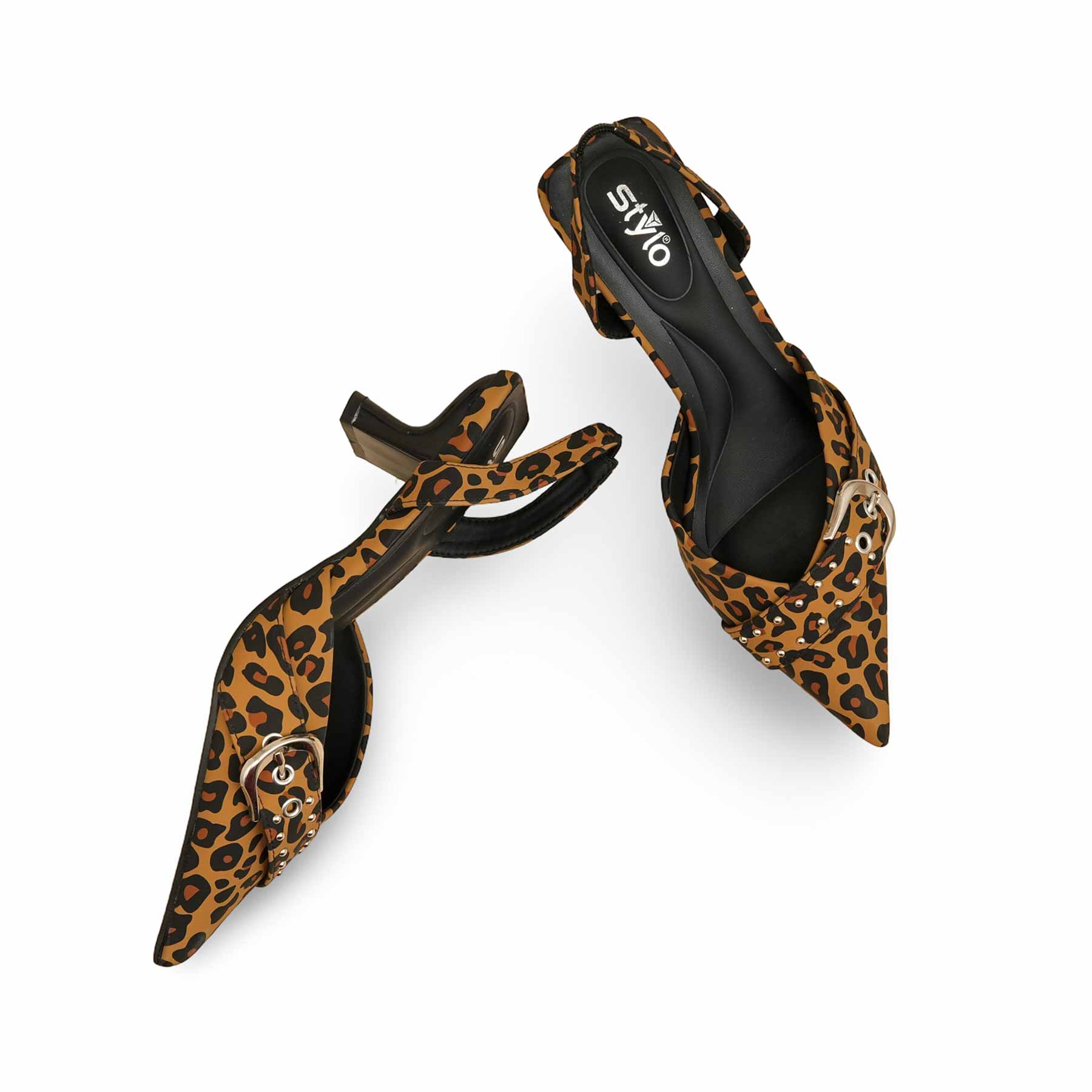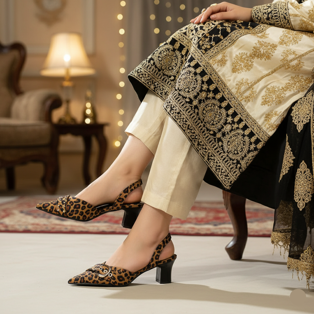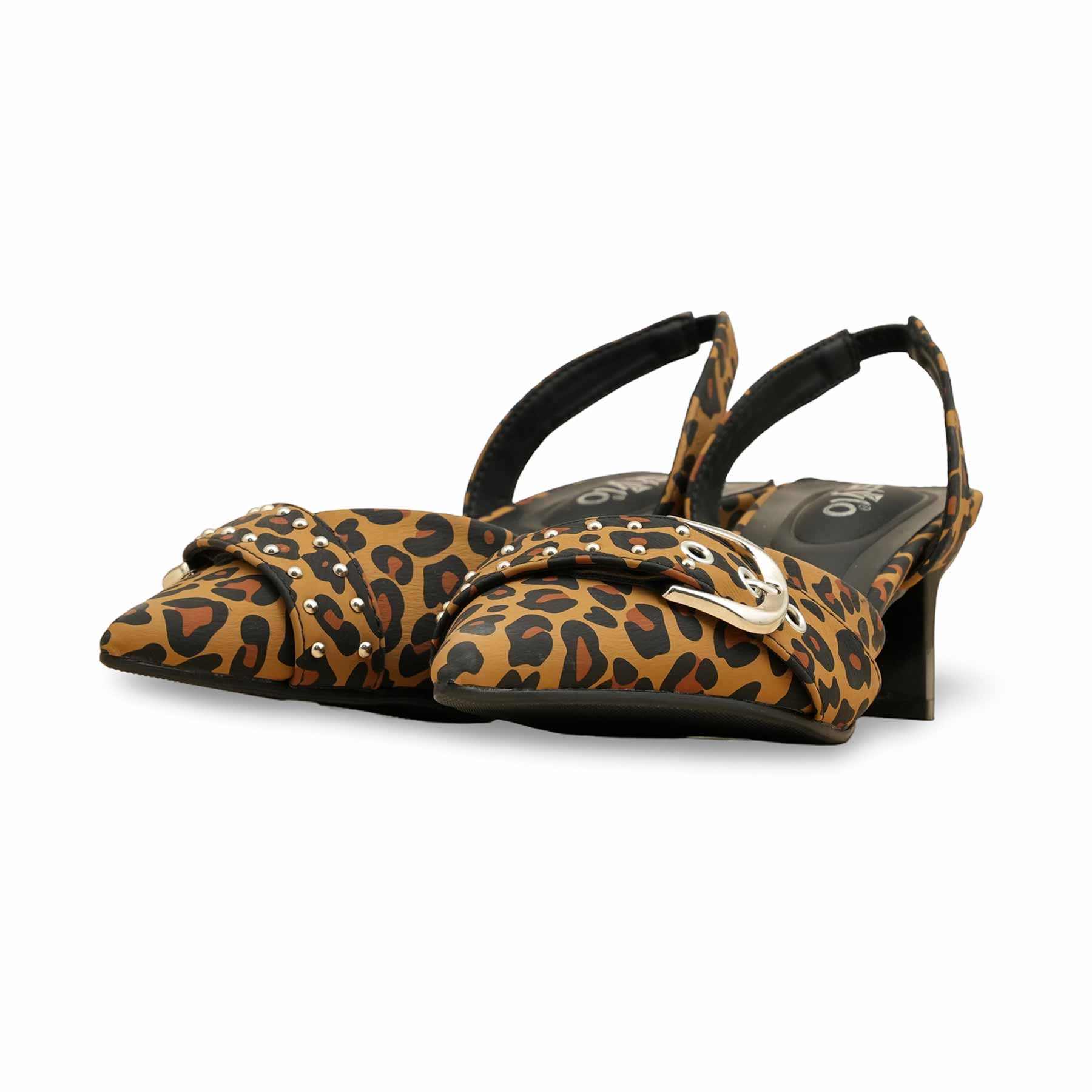Unleash your wild side with this bold leopard print Back open Shoes. The shoe features a striking all-over animal print on a velvet-look fabric and is finished with trendy buckle details across the pointed toe and the adjustable slingback strap. The low heel offers comfortable stability, making this shoe a perfect, eye-catching choice to instantly upgrade your work or weekend attire.