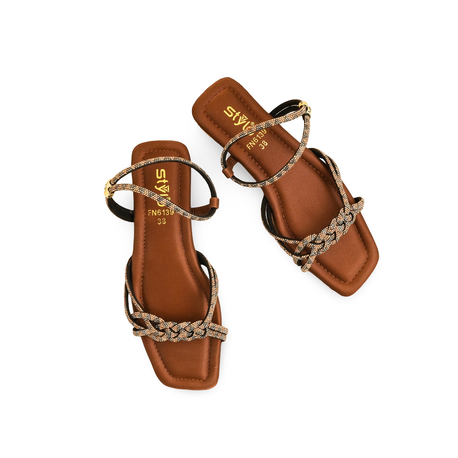 Effortless glamour! Sparkling Brown Embellished Ankle-Strap Sandals with shimmering woven rhinestone straps and delicate ankle closure. Perfect for summer evenings or special occasions.