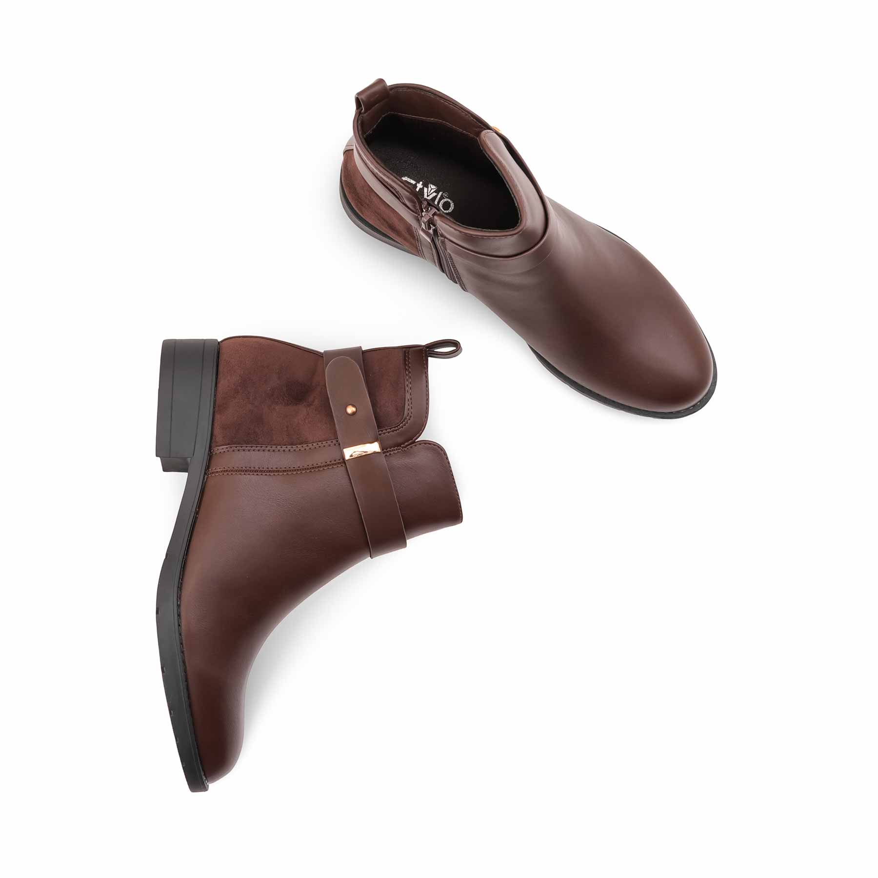 Stylish brown ankle boots for ladies, featuring a mix of smooth and suede textures with a chic buckle strap. Perfect for autumn/winter fashion.