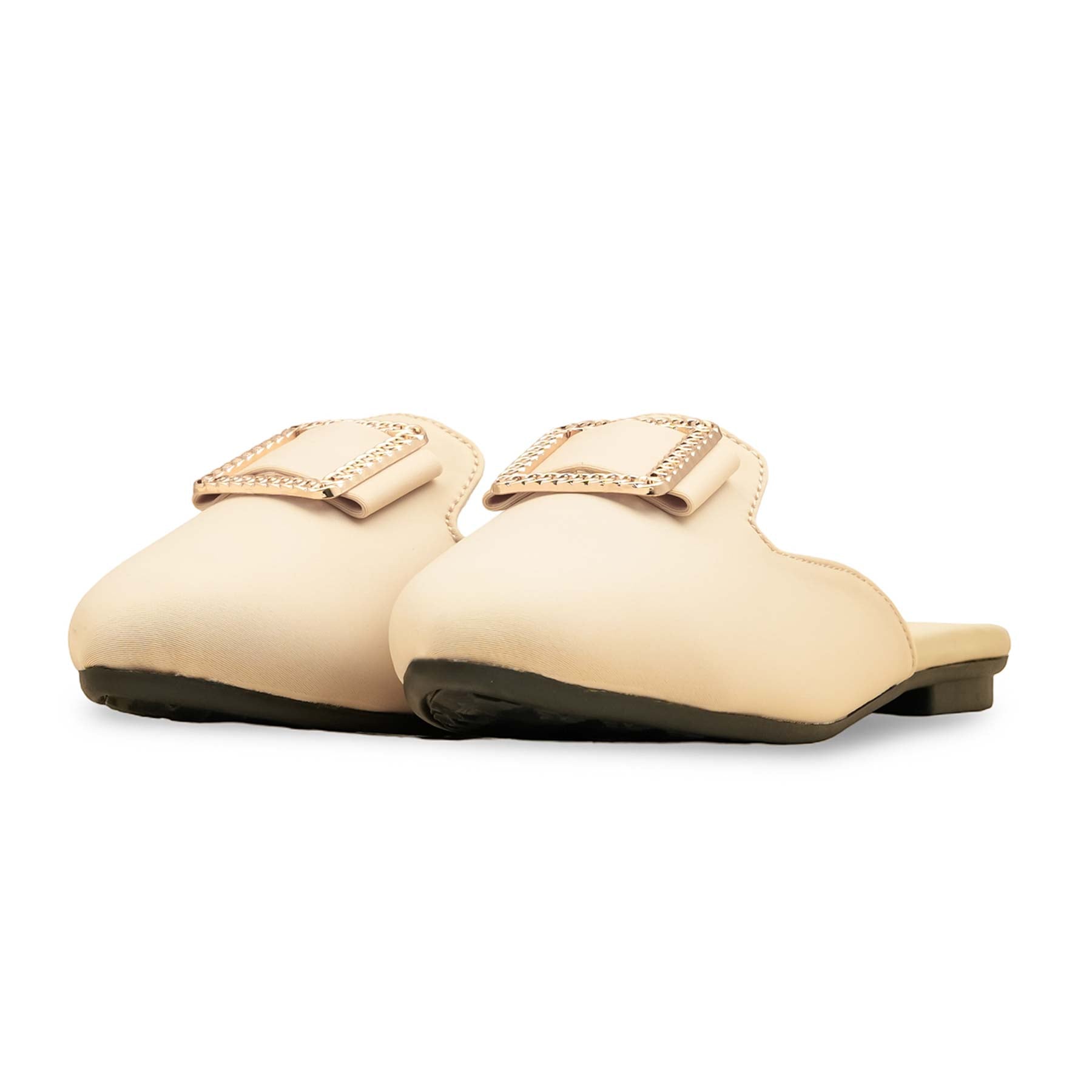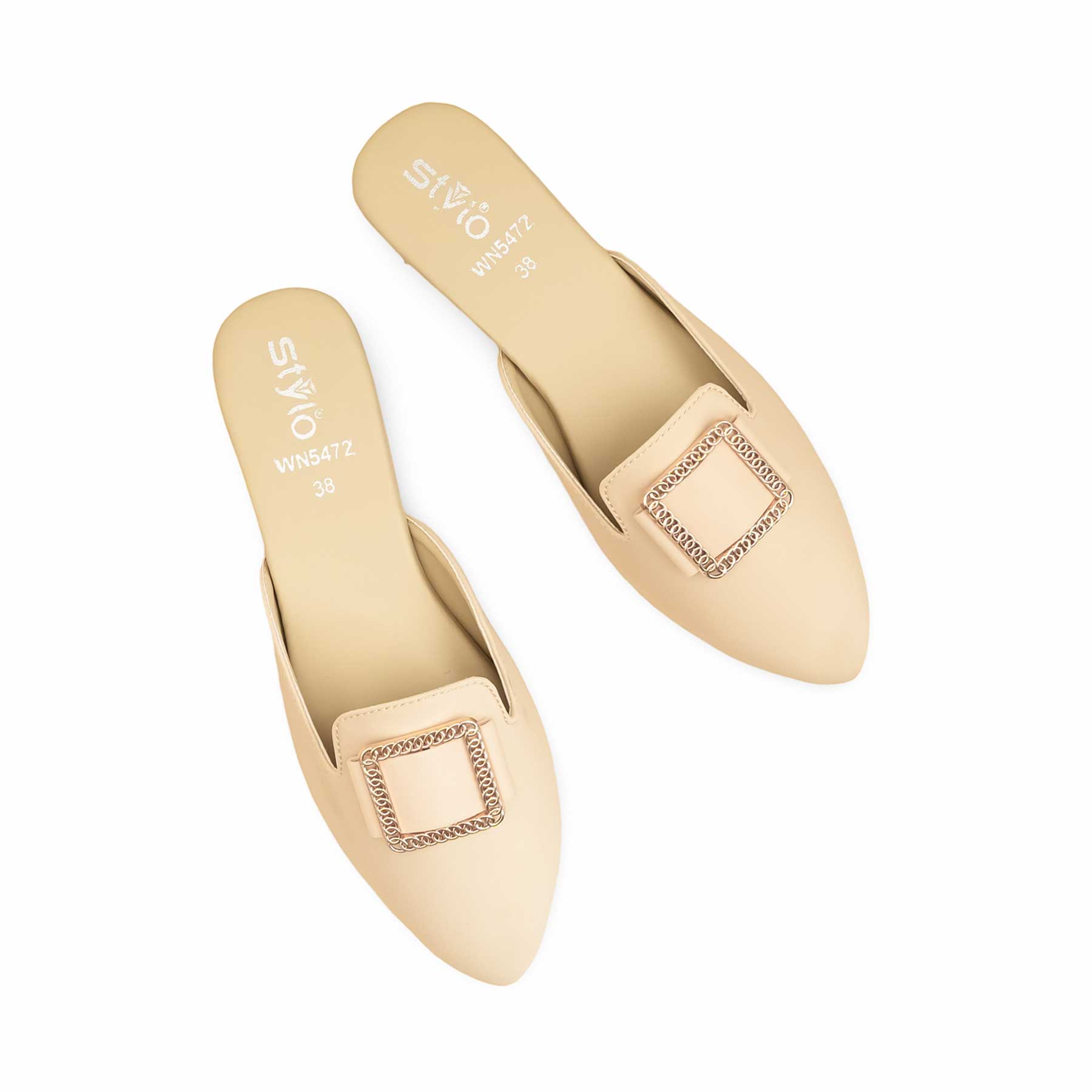 This comfortable fawn back-open flat is a slip-on mule with a smooth, synthetic upper and a striking gold-tone decorative buckle with chain-link detailing. Set on a flat sole, it provides comfort for daily casual looks, adding a vibrant pop of color to your everyday style.