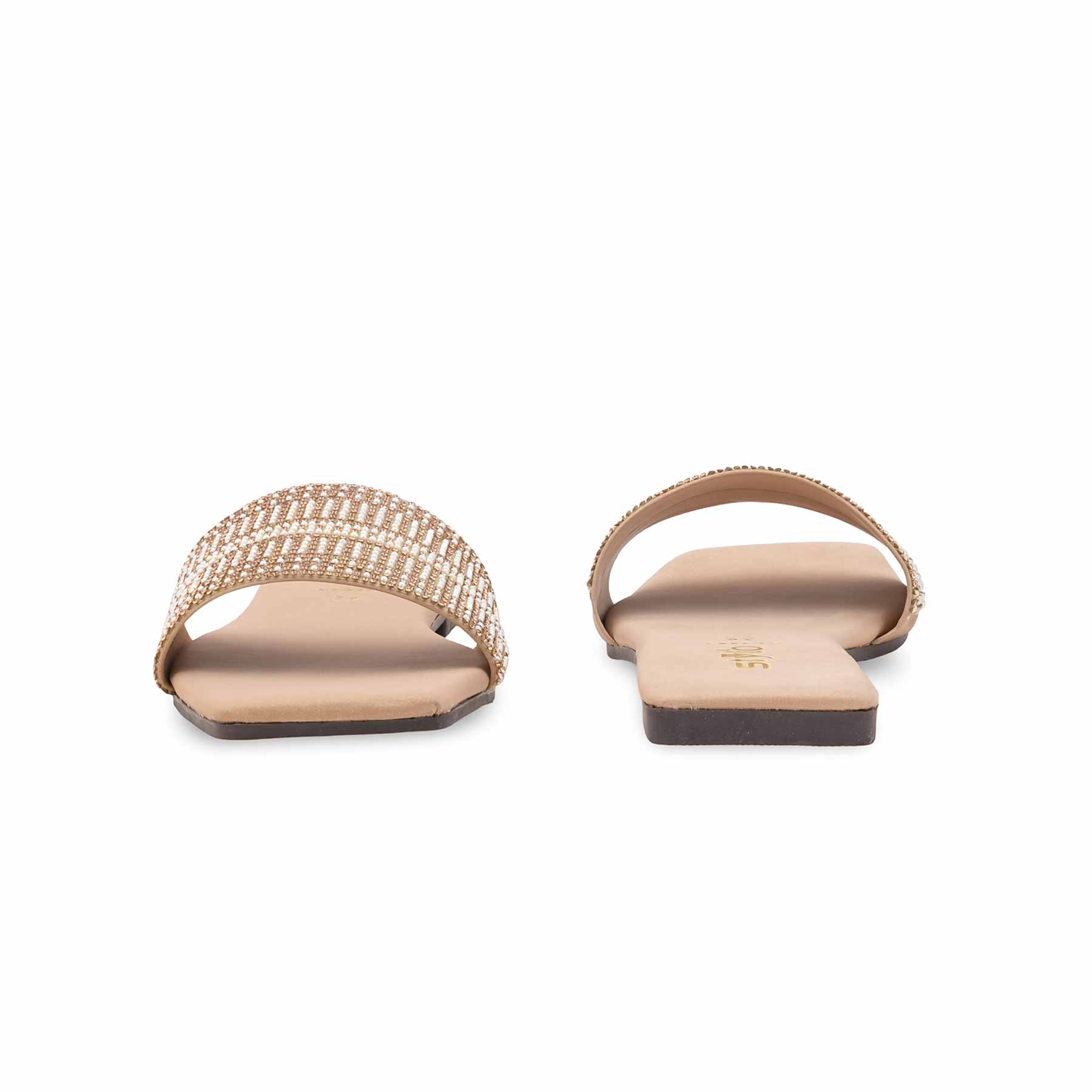 The Golden Casual Slipper offers sophisticated elegance. These square-toe flat slides feature a wide strap intricately embellished with white pearls and golden crystals. The neutral nude-beige footbed makes them a versatile choice, adding glamour to any daily or semi-formal look.
