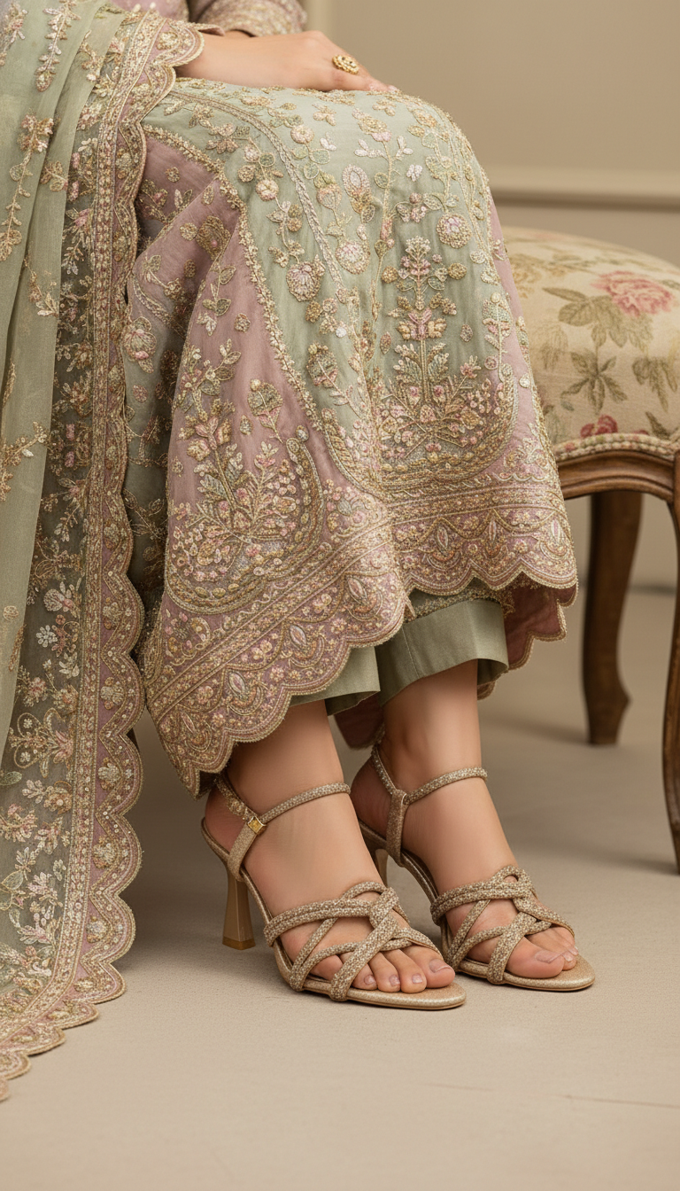 Elevate your look with this elegant golden fancy sandal for ladies. Featuring crystal-embellished braided straps and a modern flared heel, it’s the perfect choice for weddings and formal parties.