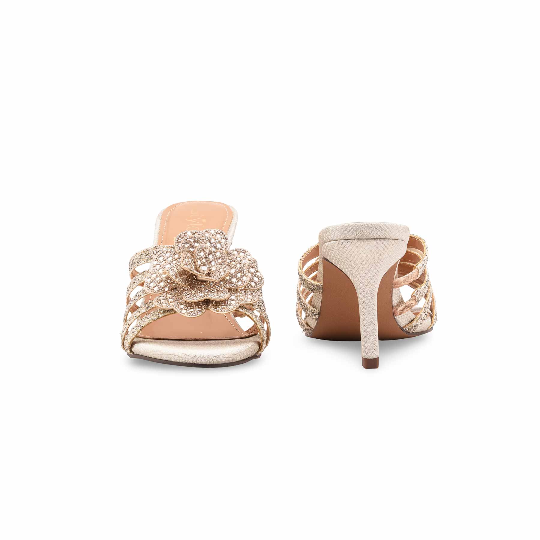 Shine at your next event with this golden fancy slipper for ladies. Featuring a stunning 3D floral embellishment, glittery multi-straps, and a sleek high heel for a glamorous party look.