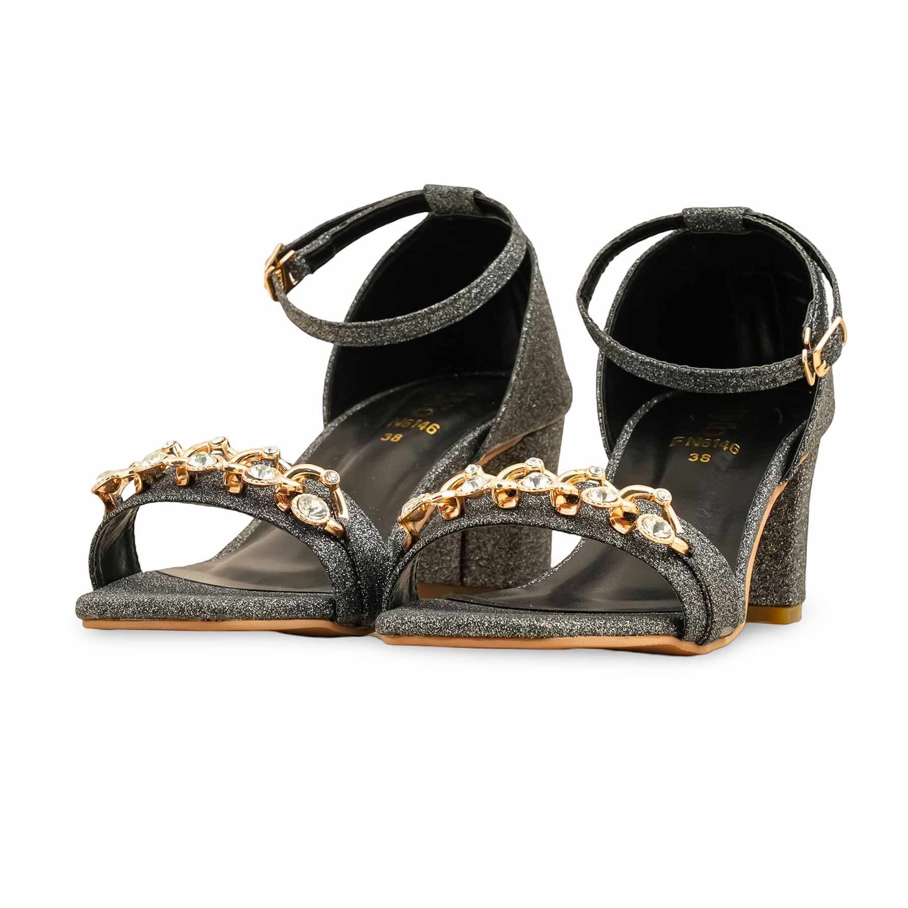 Dazzling Grey Glitter Embellished Block Heels. Shimmer with a gold and crystal-adorned front strap, perfect for glamorous evening events and special occasions.