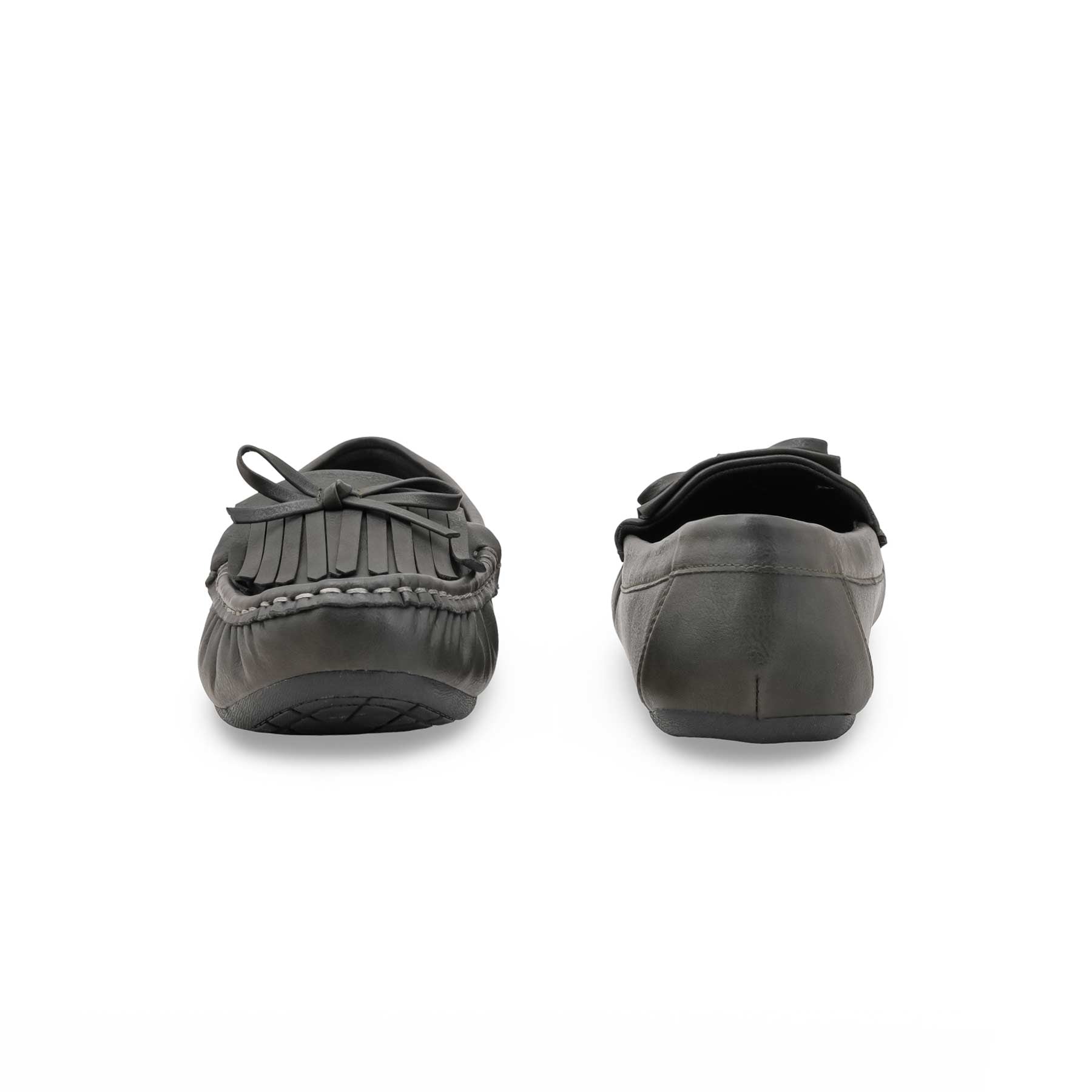 Step out in comfort with this grey moccasin for ladies. Featuring a stylish fringe upper and a dainty bow detail, this flat slip-on offers timeless casual style and ease for daily wear.