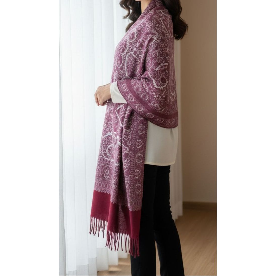 The Acrylic Winter Stole is elegantly crafted from soft, warm, and lightweight fabric, designed to add a refined layer of comfort and timeless style to your winter wardrobe.