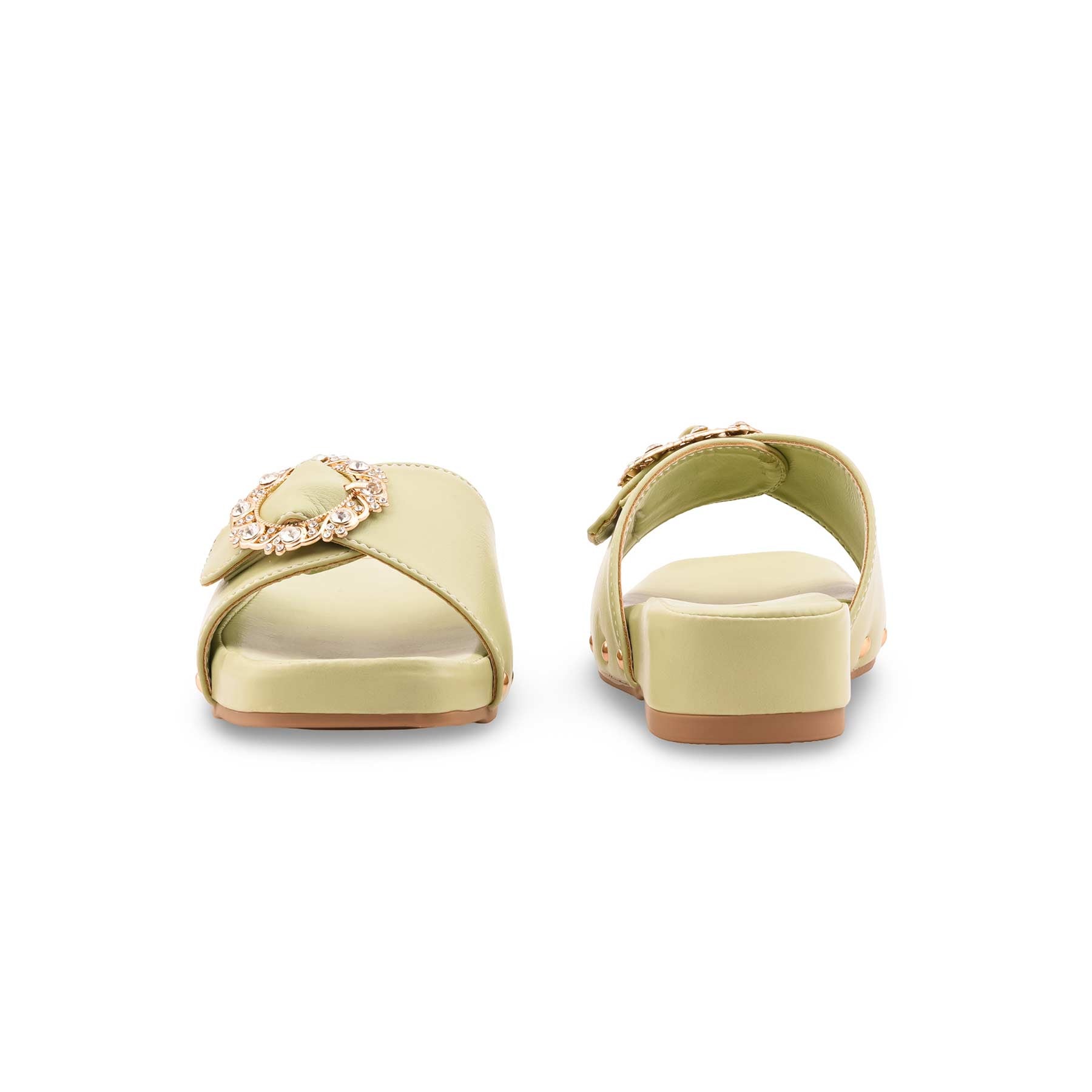 Step out in style with these elegant pistagreen formal women's slippers. Featuring a chic cross-strap design adorned with a dazzling diamante buckle, these slip-ons offer both comfort and sophistication. The subtle studded detailing on the side and a comfortable low heel make them perfect for any special occasion or elevated everyday wear.