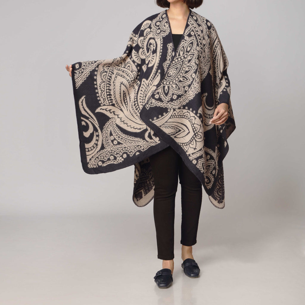 Elegant red cape shawl featuring an eye-catching printed design.