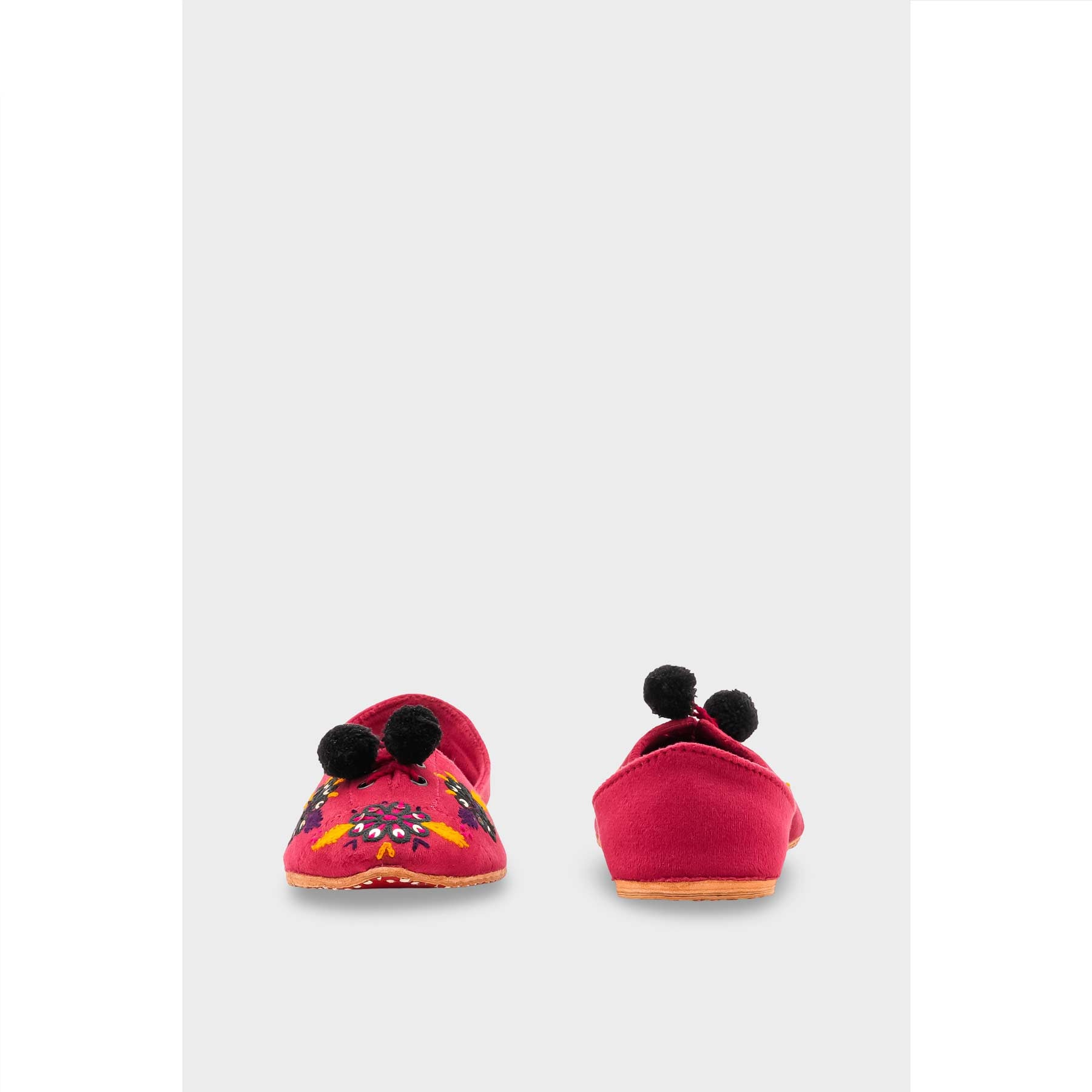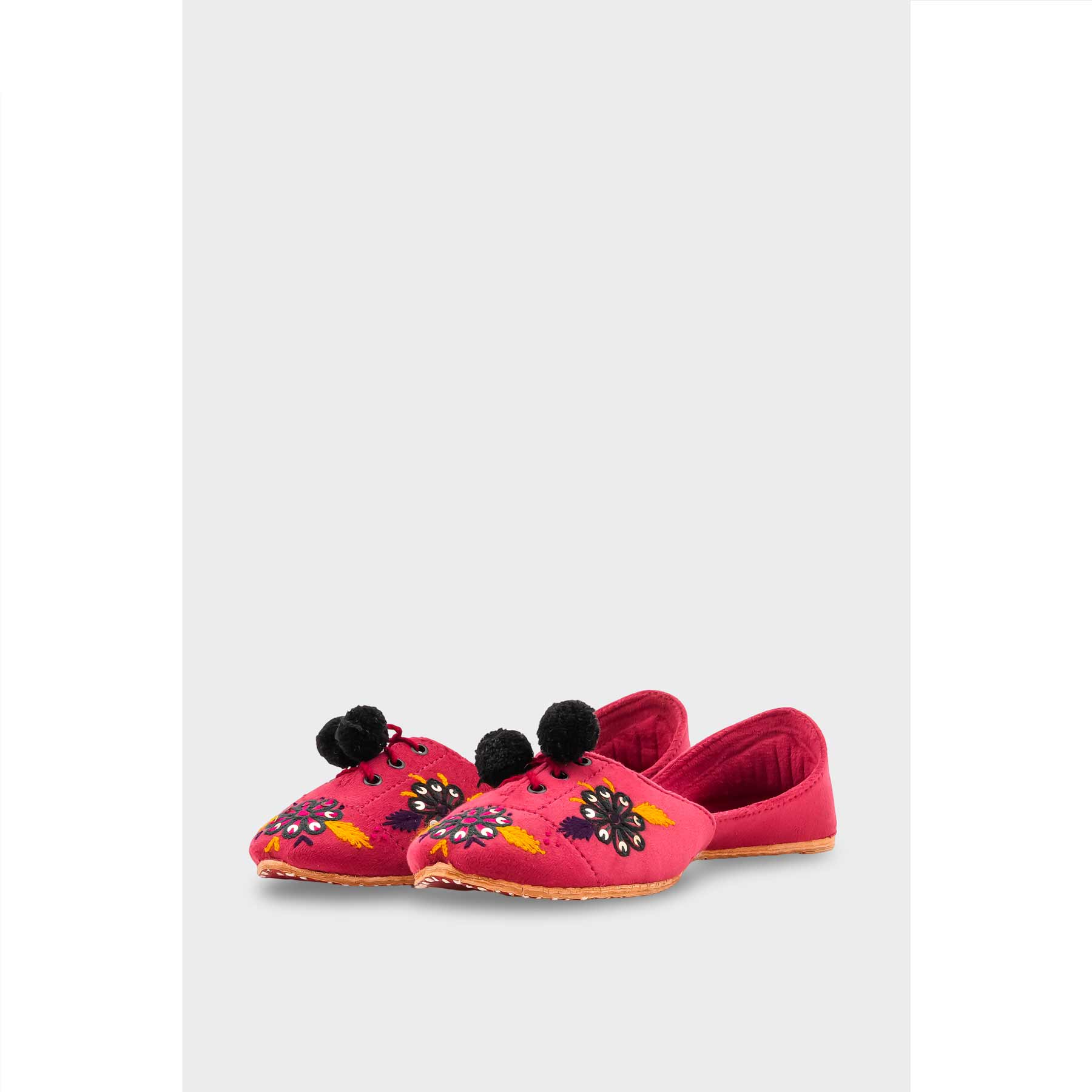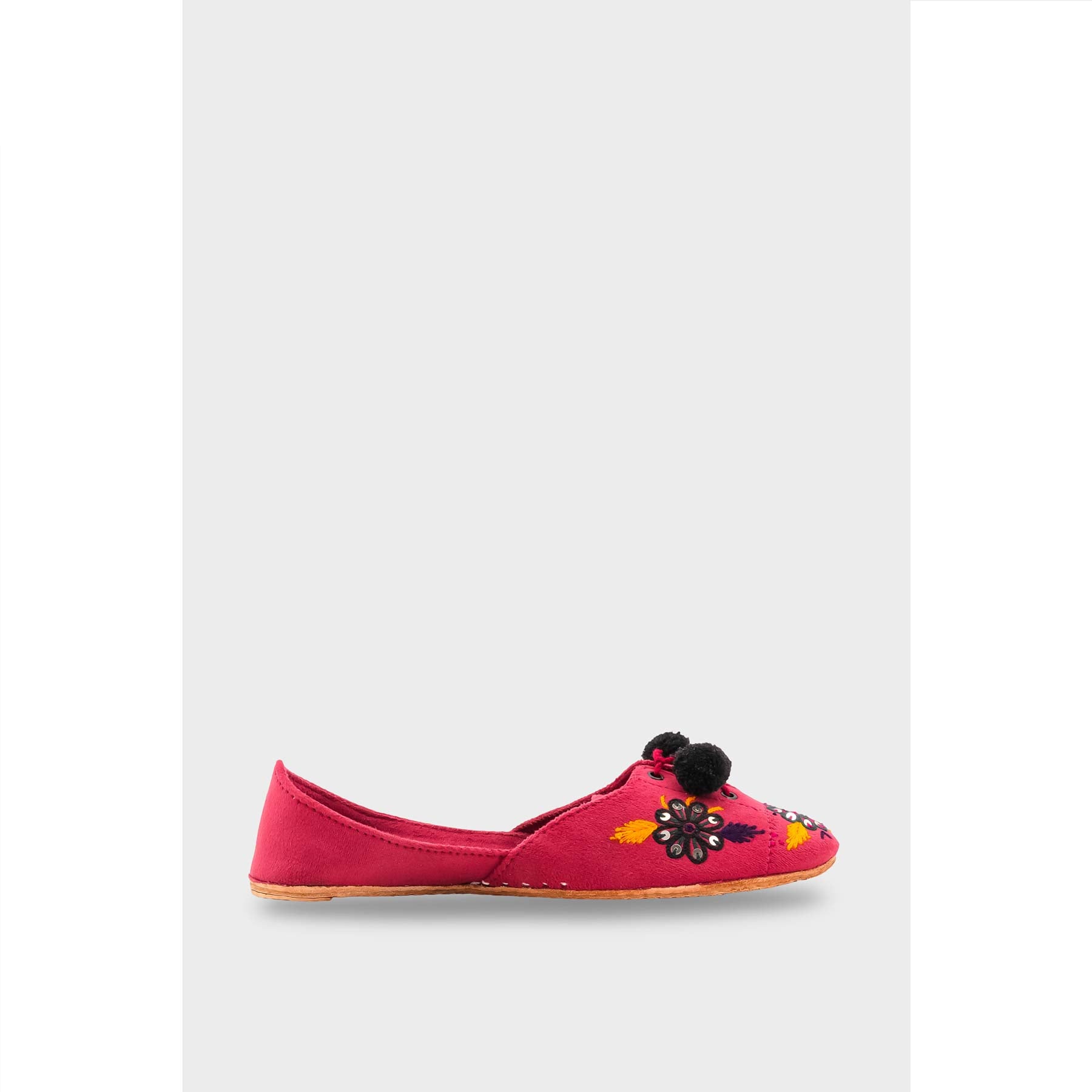 Brighten your step with this women's Skpink leather Khussa. Adorned with playful black pom-poms and vibrant embroidery, this handcrafted ethnic flat blends traditional style with modern fun.