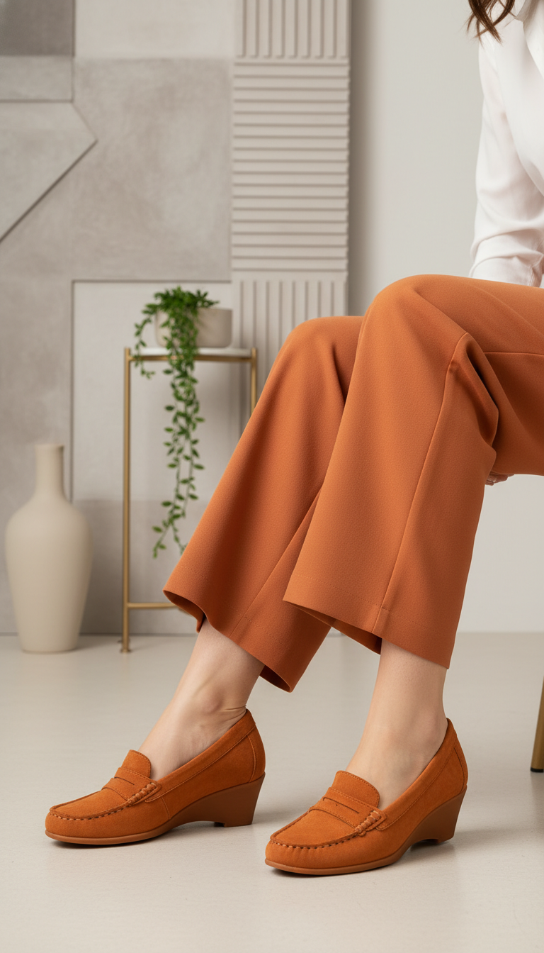 Step out in comfort with this tan winter moccasin for ladies. Crafted with a soft suede upper and a supportive wedge heel, this stylish slip-on is perfect for daily wear and formal office settings.