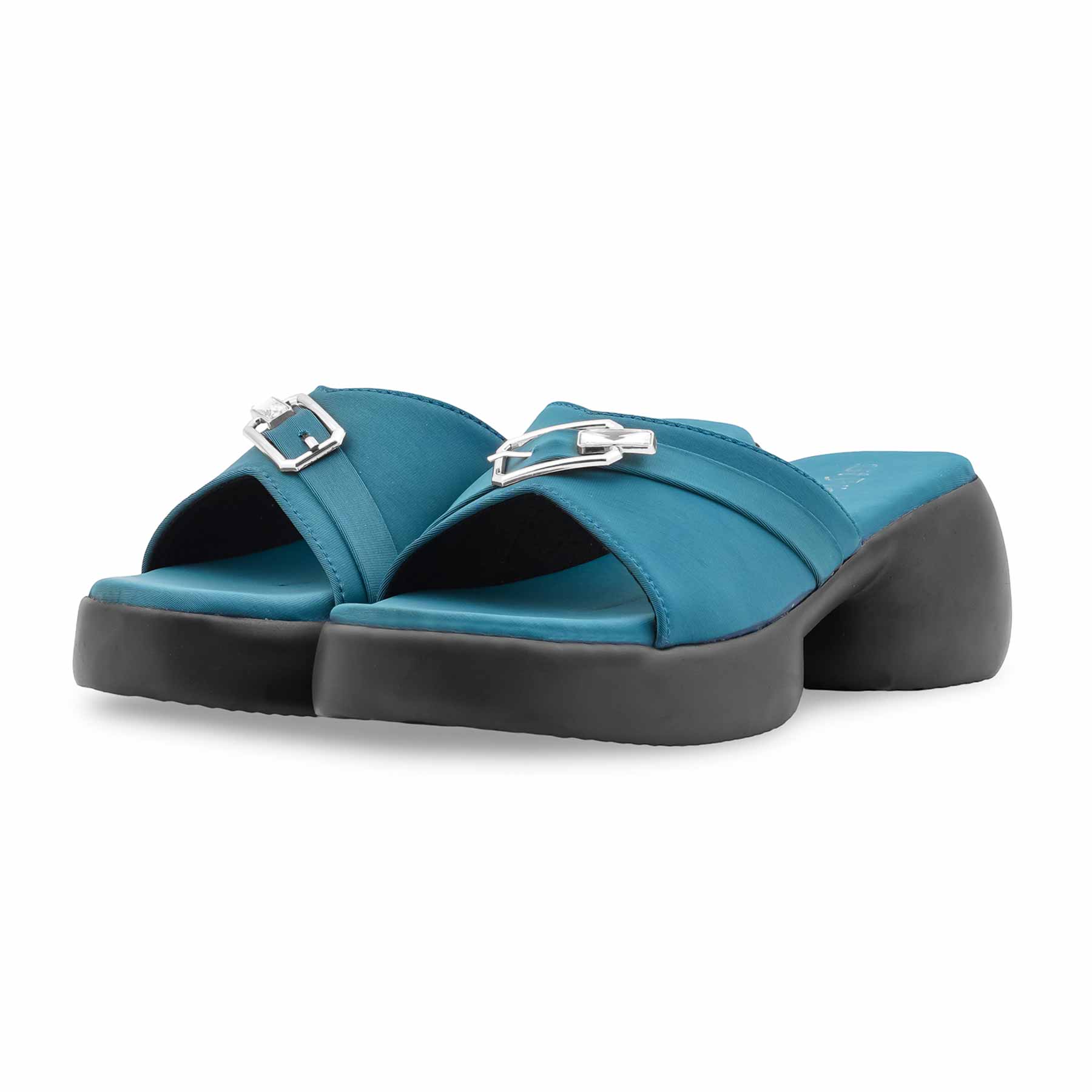 Elevate your look with this elegant Teal Blue Formal Slipper for women. Featuring a stylish silver buckle and a comfortable black platform sole, it is perfect for office wear or formal events.