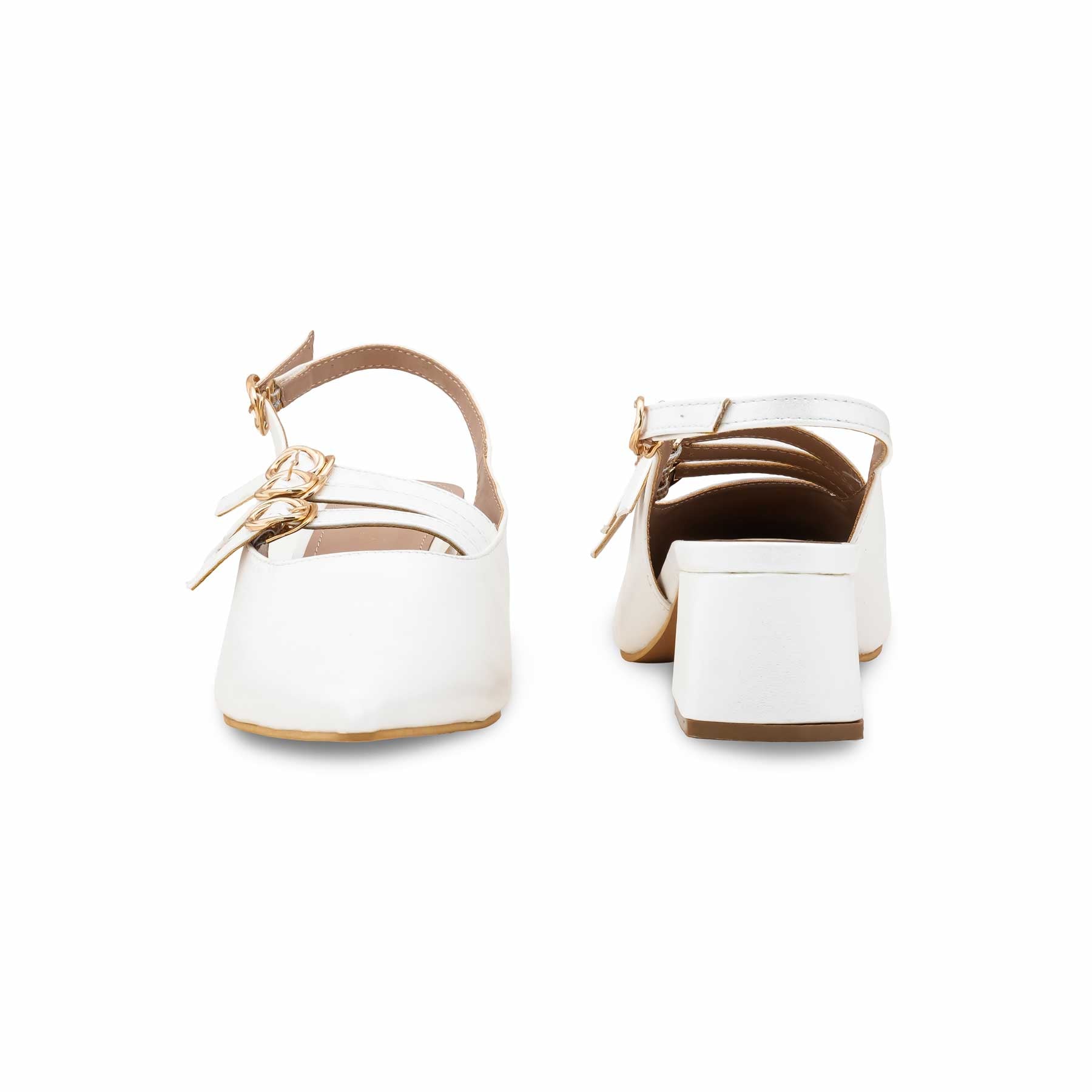 Step into fresh sophistication with these White Back Open Heels for Women. Featuring a stylish pointed toe, comfortable block heel, and eye-catching triple buckle detailing across the vamp, these slingback pumps are perfect for adding a chic and modern touch to your office wear, weekend brunch, or special occasions.