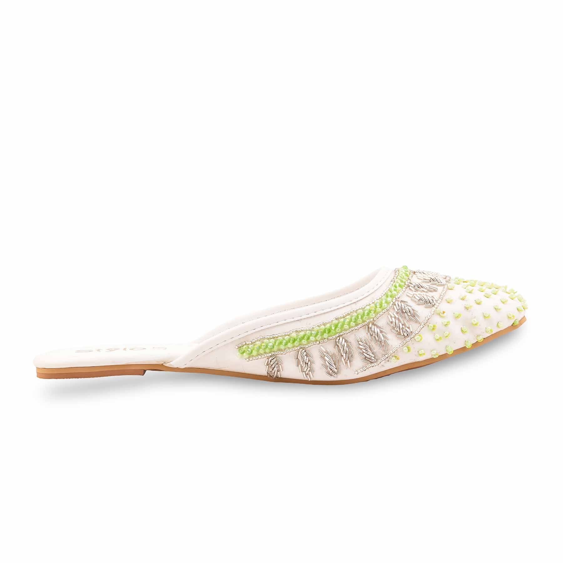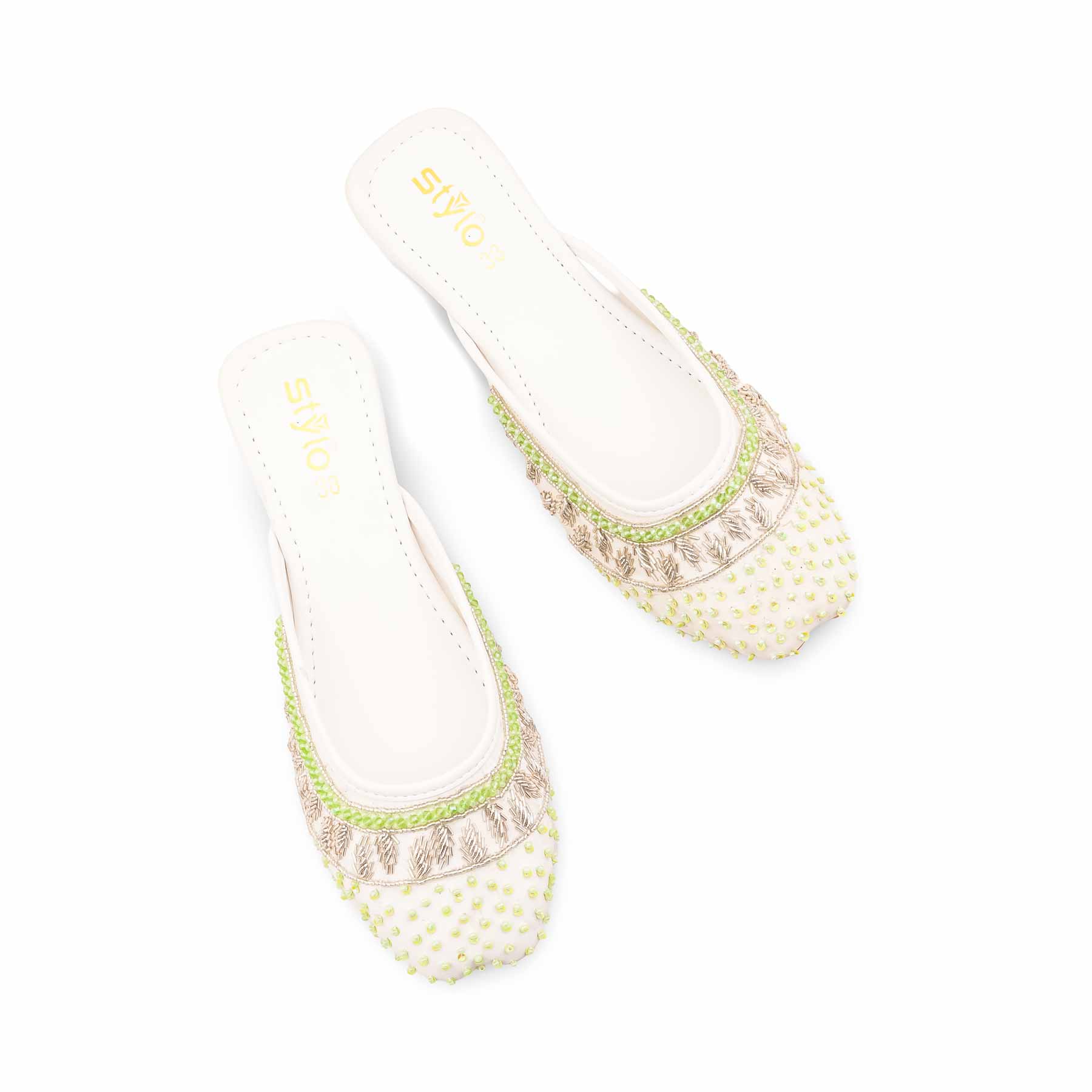 This elegant white fancy back open khussa features intricate gold beadwork and sequins. Its slip-on mule design offers a perfect ethnic look for weddings and festive celebrations.