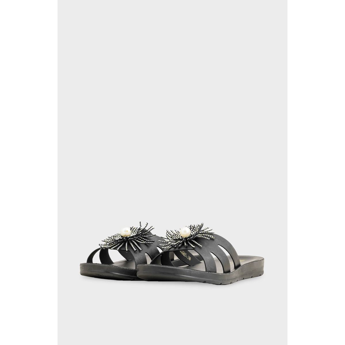 Make a glamorous statement with the Flower Slipper. The bold black strap features stylish cut-outs and is topped with an eye-catching 3D flower decorated with sparkling rhinestones and a large faux pearl center. With a comfortable slip-on fit and a cushioned sole, this slipper is perfect for adding a touch of dressy elegance and sparkle to your outfit.