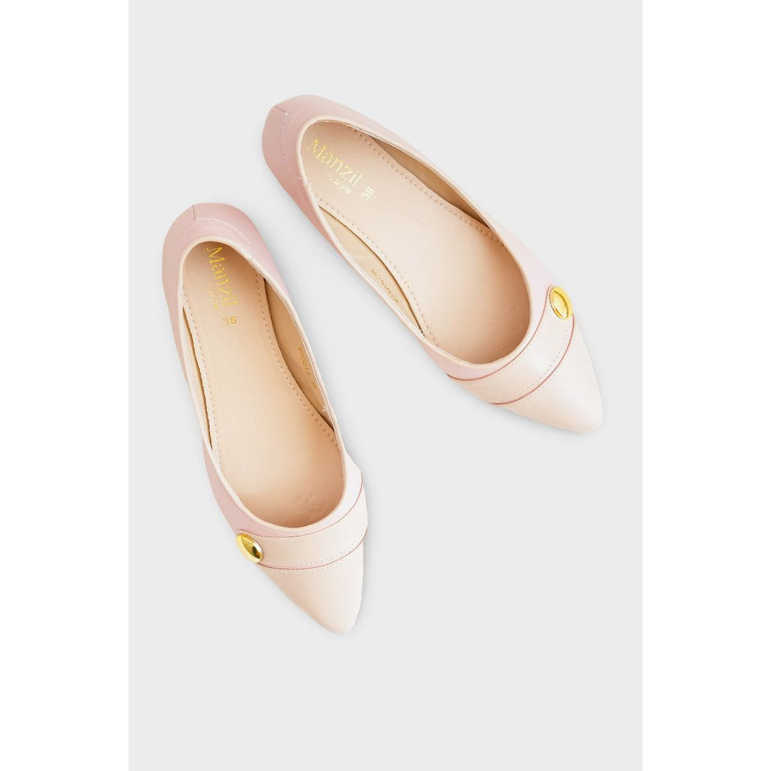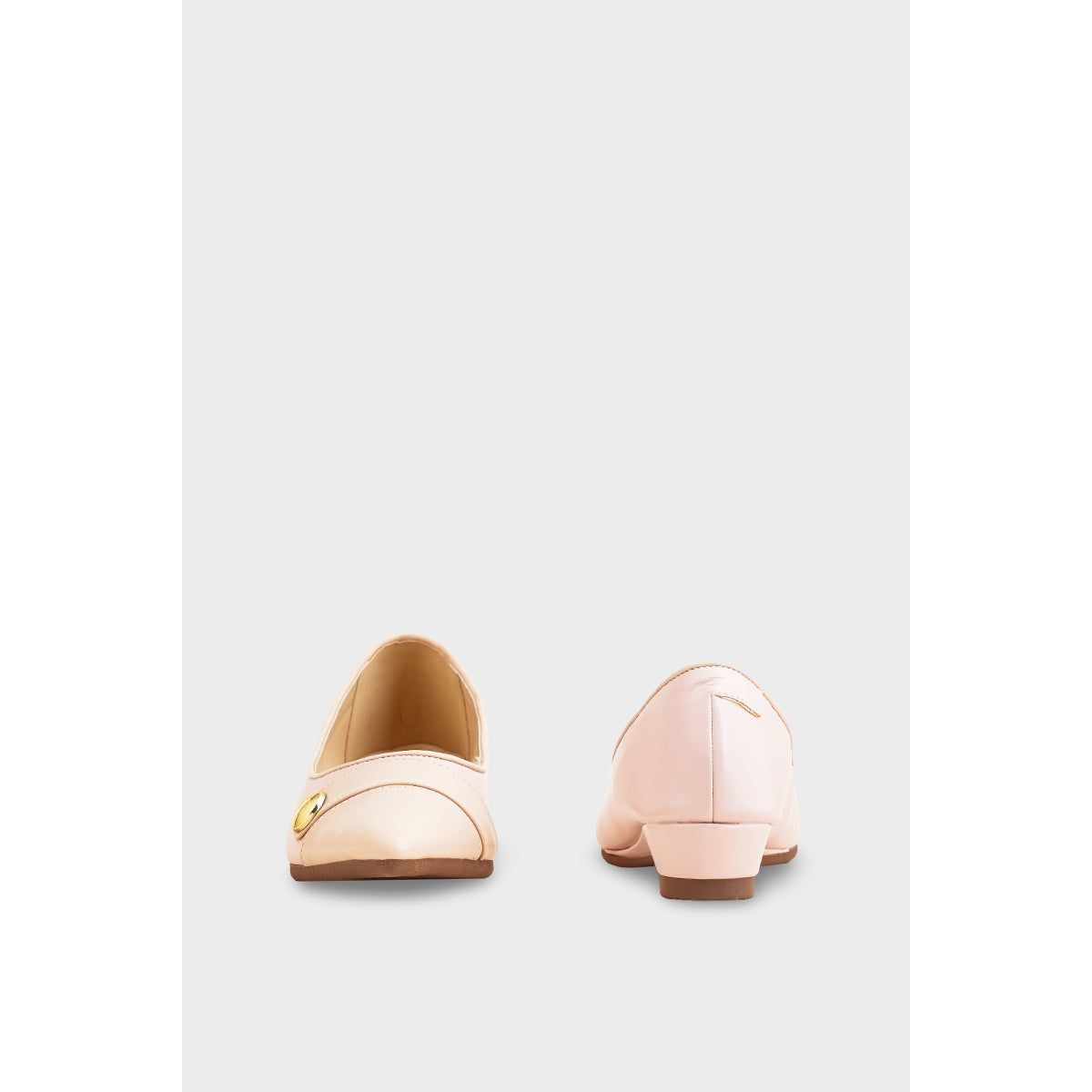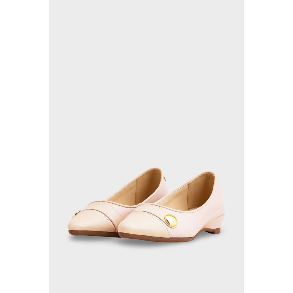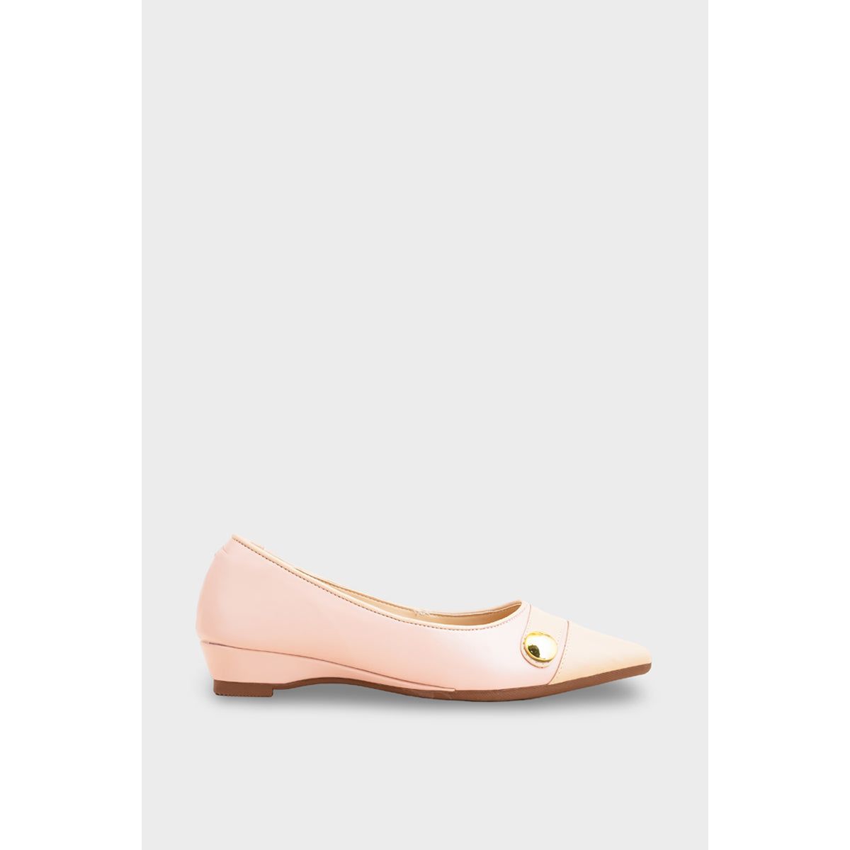 Perfect for work or dressier occasions, this pump offers elegance with incredible comfort. It features a classic rounded toe and a delicate two-tone pink design accented by a sleek gold button. The low, stable wedge heel provides just the right amount of lift, making this shoe a comfortable and polished choice for all-day wear.